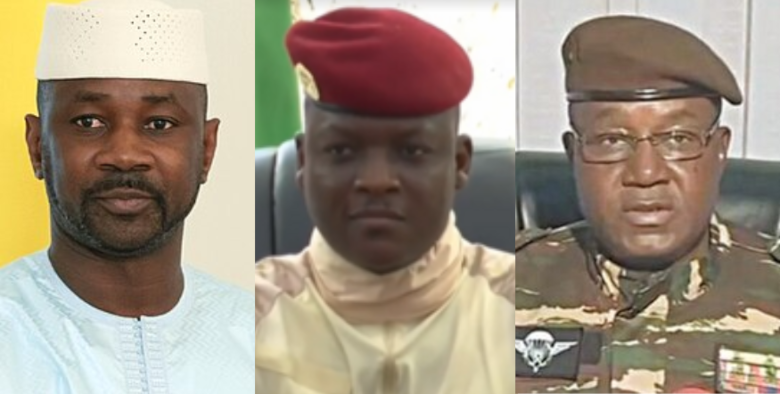 The leaders of the military regimes: Goïta (Mali), Traoré (Burkina Faso), and Tchiani (Niger) (Photo: President of Russia [CC BY 4.0], Lamine Traoré / VOA [Public domain], Office of Radio and Television of Niger [Fair use] / Wikimedia Commons)